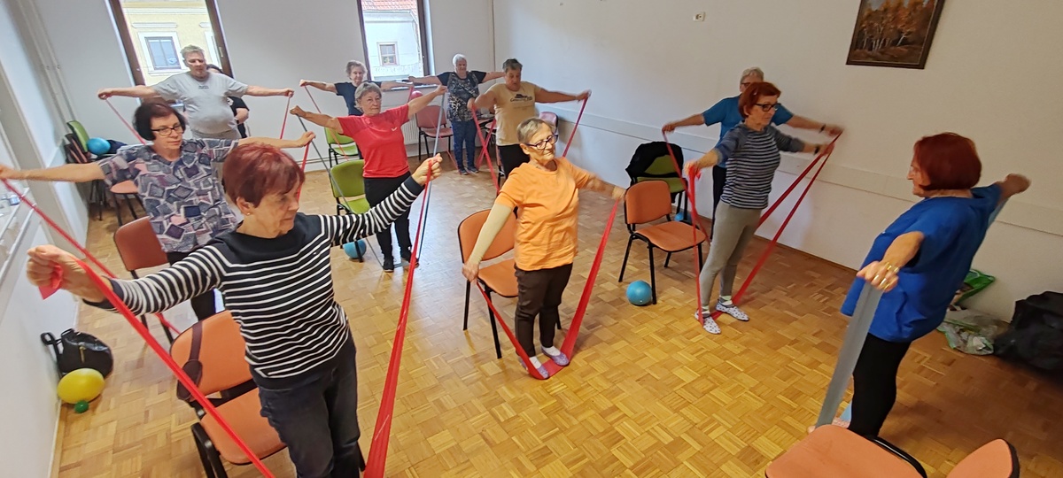 Udeleženci vadijo sede in stoje s poudarkom na krepitvi mišic, ravnotežja, gibljivosti in koordinacije. Pri vajah uporabljajo ježkaste žogice, žoge in elastične trakove za krepitev mišic.