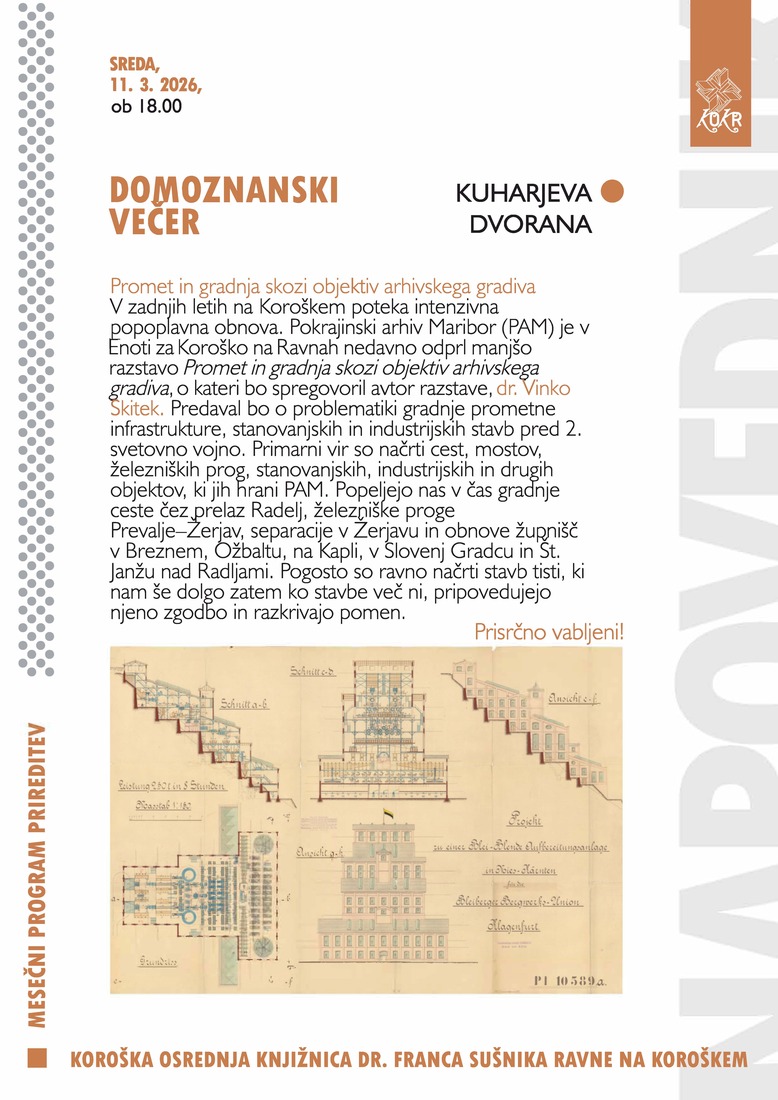 V zadnjih letih na Koroškem poteka intenzivna popoplavna obnova. Pokrajinski arhiv Maribor (PAM) je v Enoti za Koroško na Ravnah nedavno odprl manjšo razstavo Promet in gradnja skozi objektiv arhivskega gradiva, o kateri bo spregovoril avtor razstave, dr. Vinko Skitek. Predaval bo o problematiki gradnje prometne infrastrukture, stanovanjskih in industrijskih stavb pred 2. svetovno vojno. Primarni vir so načrti cest, mostov, železniških prog, stanovanjskih, industrijskih in drugih objektov, ki jih hrani PAM. Popeljejo nas v čas gradnje ceste čez prelaz Radelj, železniške proge Prevalje–Žerjav, separacije v Žerjavu in obnove župnišč v Breznem, Ožbaltu, na Kapli, v Slovenj Gradcu in Št. Janžu nad Radljami. Pogosto so ravno načrti stavb tisti, ki nam še dolgo zatem ko stavbe več ni, pripovedujejo njeno zgodbo in razkrivajo pomen.