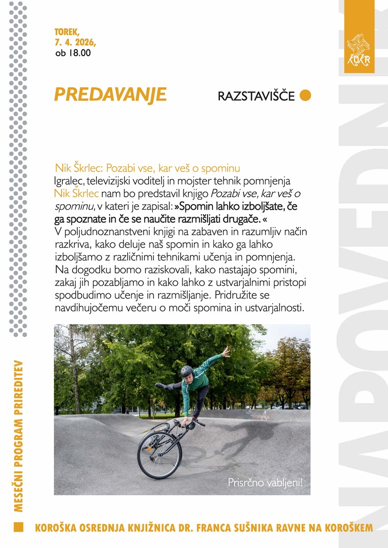 Igralec, televizijski voditelj in mojster tehnik pomnjenja Nik Škrlec nam bo predstavil knjigo Pozabi vse, kar veš o spominu, v kateri je zapisal: »Spomin lahko izboljšate, če ga spoznate in če se naučite razmišljati drugače.«