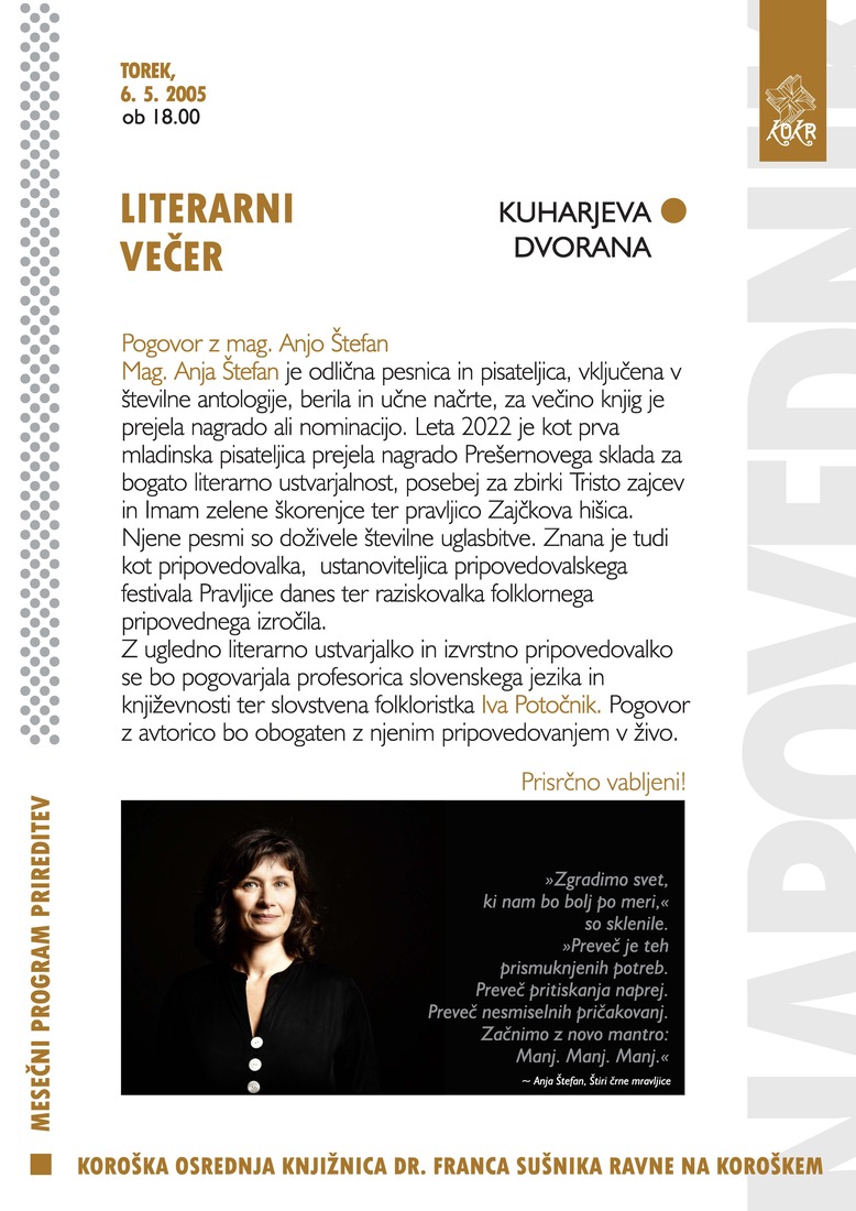 Mag. Anja Štefan je odlična pesnica in pisateljica, vključena v številne antologije, berila in učne načrte, za večino knjig je prejela nagrado ali nominacijo. Leta 2022 je kot prva mladinska pisateljica prejela nagrado Prešernovega sklada za bogato literarno ustvarjalnost, posebej za zbirki Tristo zajcev in Imam zelene škorenjce ter pravljico Zajčkova hišica. Njene pesmi so doživele številne uglasbitve. Znana je tudi kot pripovedovalka, ustanoviteljica pripovedovalskega festivala Pravljice danes ter raziskovalka folklornega pripovednega izročila.