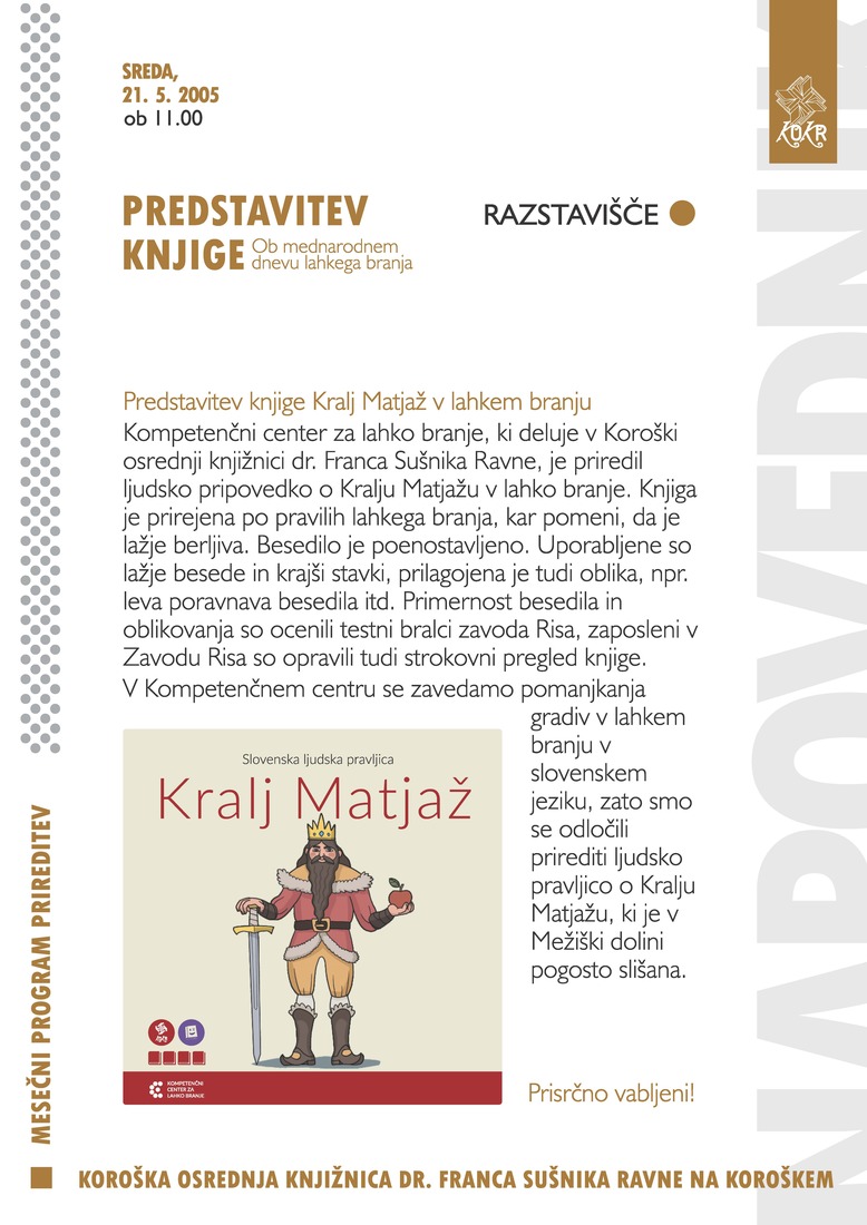 Kompetenčni center za lahko branje, ki deluje v Koroški osrednji knjižnici, bo predstavil knjigo Kralj Matjaž v lahkem branju.