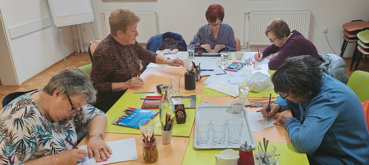 Na delavnici ustvarjamo voščilnice, čestitke in pobarvanke, ki krasijo stene naših prostorov in so darila za naše goste.