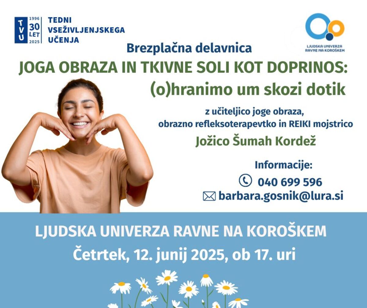 – seznanili se bomo s sproščujočo in osvežujočo vadbo joge obraza, ki pomaga pri toniranju mišic, sprostitvi napetosti in naravni lepoti. Učinki so tako zdravstveni kot tudi estetski.