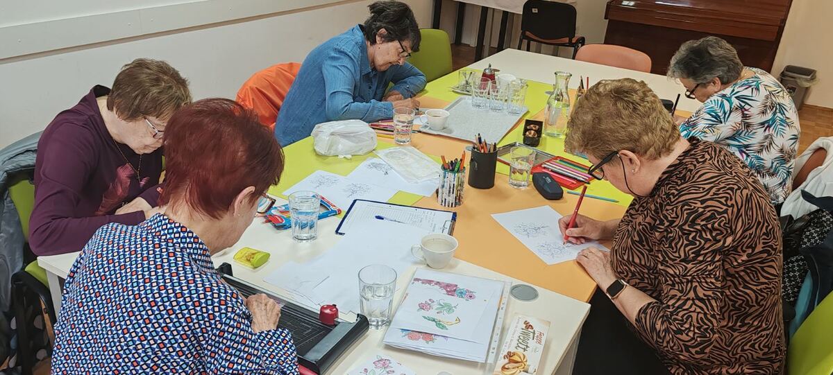 Na delavnici ustvarjamo voščilnice, čestitke in pobarvanke, ki krasijo stene naših prostorov in so darila za naše goste.