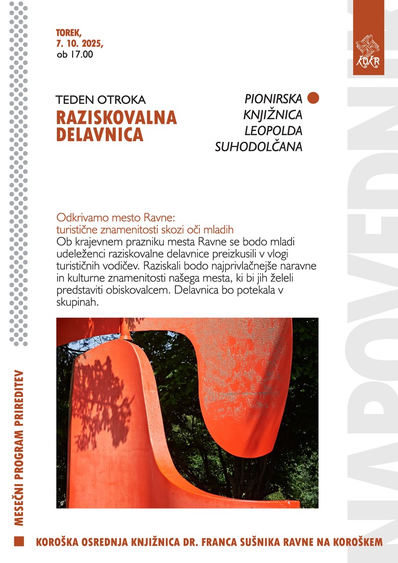 Ob krajevnem prazniku mesta Ravne se bodo mladi udeleženci raziskovalne delavnice preizkusili v vlogi turističnih vodičev. Raziskali bodo najprivlačnejše naravne in kulturne znamenitosti našega mesta, ki bi jih želeli predstaviti obiskovalcem. Delavnica bo potekala v skupinah.