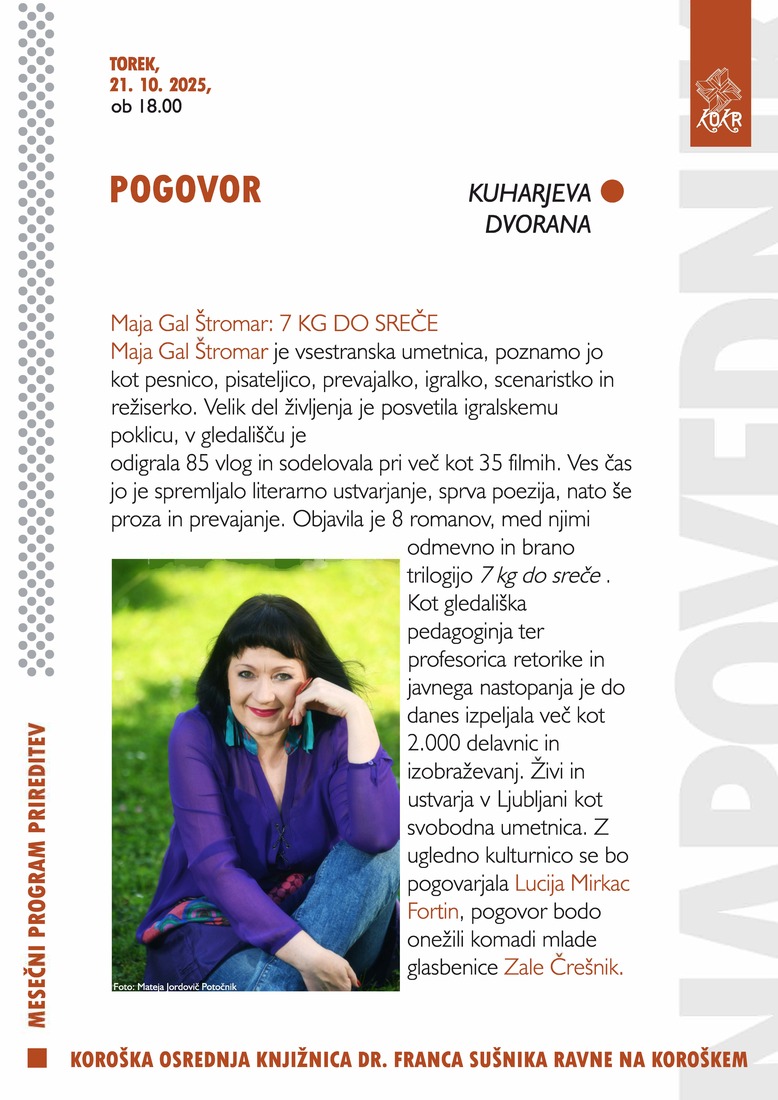 Maja Gal Štromar je vsestranska umetnica, poznamo jo kot pesnico, pisateljico, prevajalko, igralko, scenaristko in režiserko. Velik del življenja je posvetila igralskemu poklicu, v gledališču je odigrala 85 vlog in sodelovala pri več kot 35 filmih. Ves čas jo je spremljalo literarno ustvarjanje, sprva poezija, nato še proza in prevajanje. Objavila je 8 romanov, med njimi odmevno in brano trilogijo 7 kg do sreče. Kot gledališka pedagoginja ter profesorica retorike in javnega nastopanja je do danes izpeljala več kot 2.000 delavnic in izobraževanj. Živi in ustvarja v Ljubljani kot svobodna umetnica. Z ugledno kulturnico se bo pogovarjala Lucija Mirkac Fortin, pogovor bodo onežili komadi mlade glasbenice Zale Črešnik.