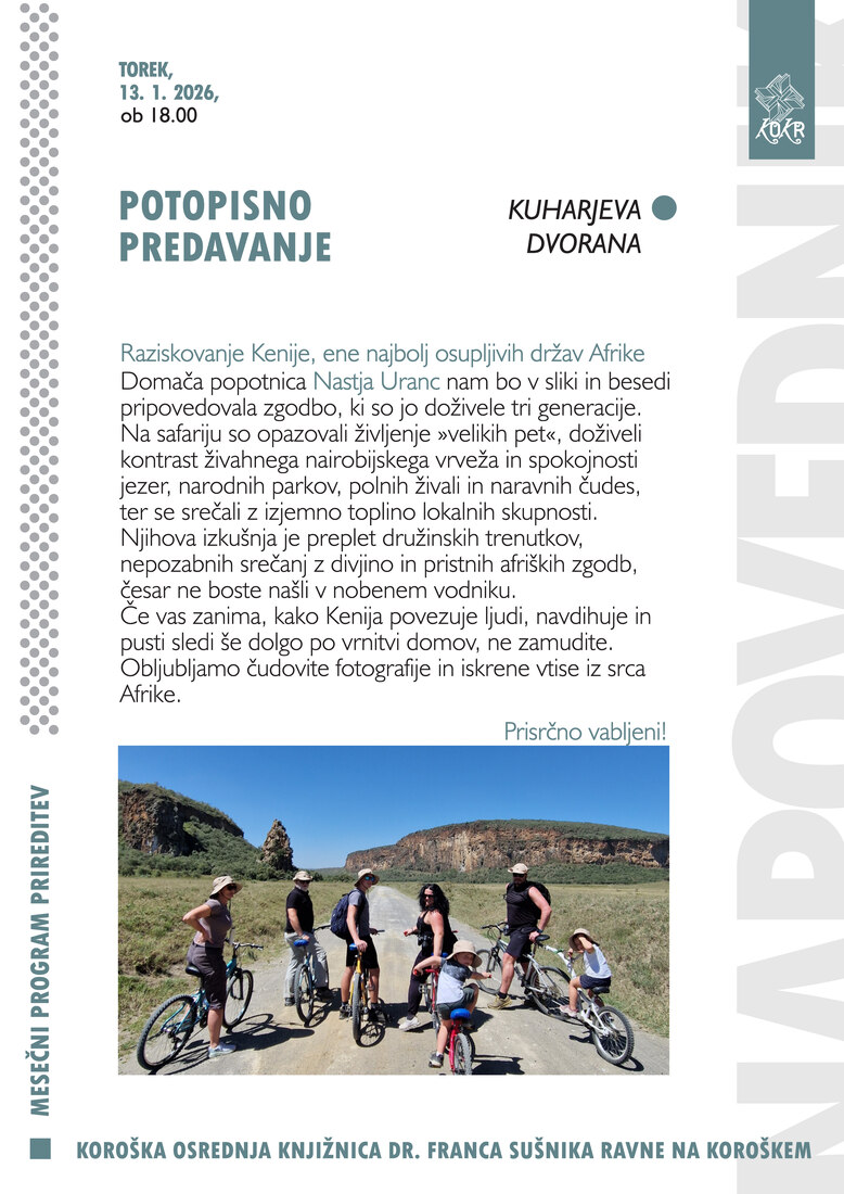 Domača popotnica Nastja Uranc nam bo v sliki in besedi pripovedovala zgodbo, ki so jo doživele tri generacije. Na safariju so opazovali življenje »velikih pet«, doživeli kontrast živahnega nairobijskega vrveža in spokojnosti jezer, narodnih parkov, polnih živali in naravnih čudes, ter se srečali z izjemno toplino lokalnih skupnosti.
