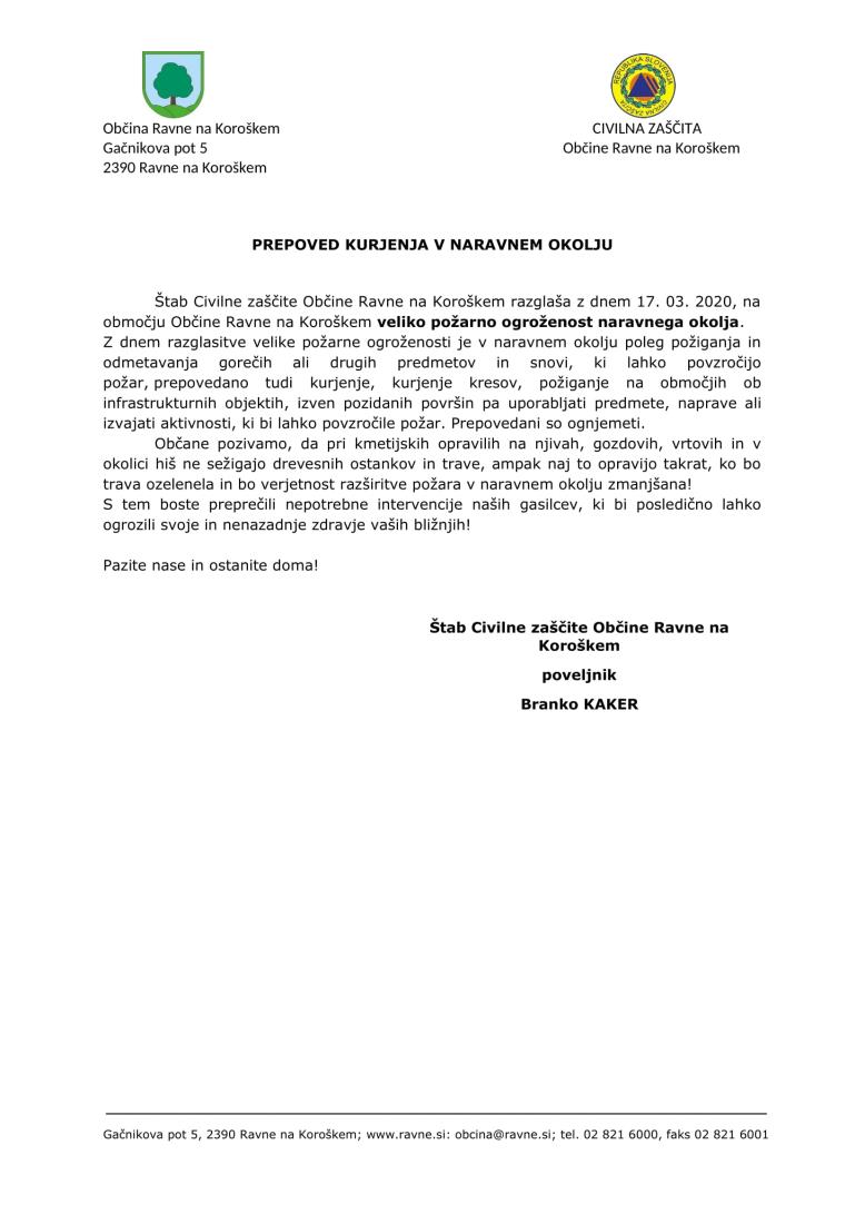 Štab Civilne zaščite Občine Ravne na Koroškem razglaša z dnem 17. 03. 2020, na območju Občine Ravne na Koroškem veliko požarno ogroženost naravnega okolja.