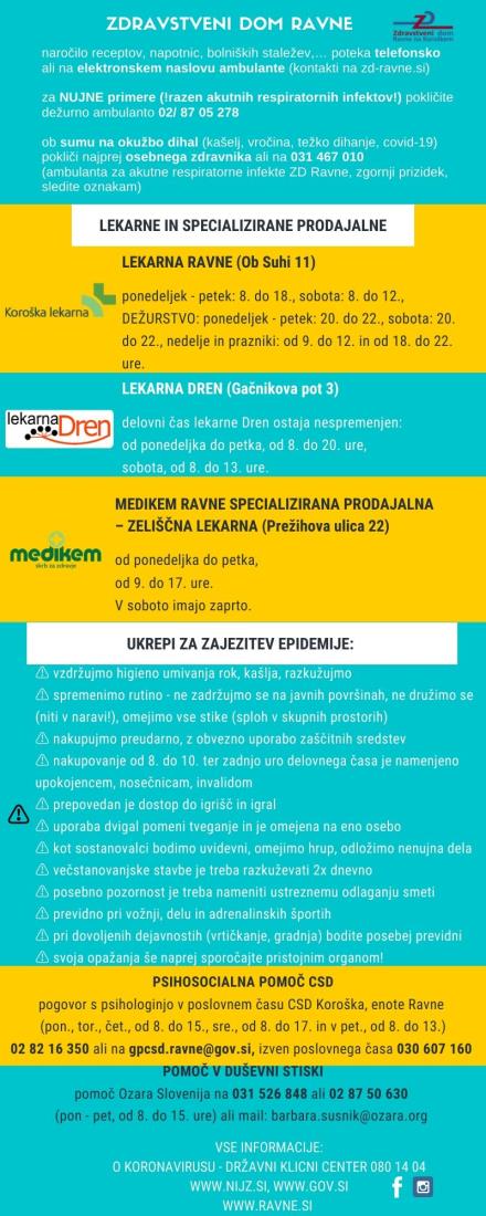 - Če osebni zdravnik ni dostopen pokličite dežurno službo ZD Ravne 02 8705 278. Če je vaše stanje tako resno, da potrebujete nujno medicinsko pomoč (nenadna zelo visoka vročina, gnojno izkašljevanje, težave z dihanjem), pokličite 112.
