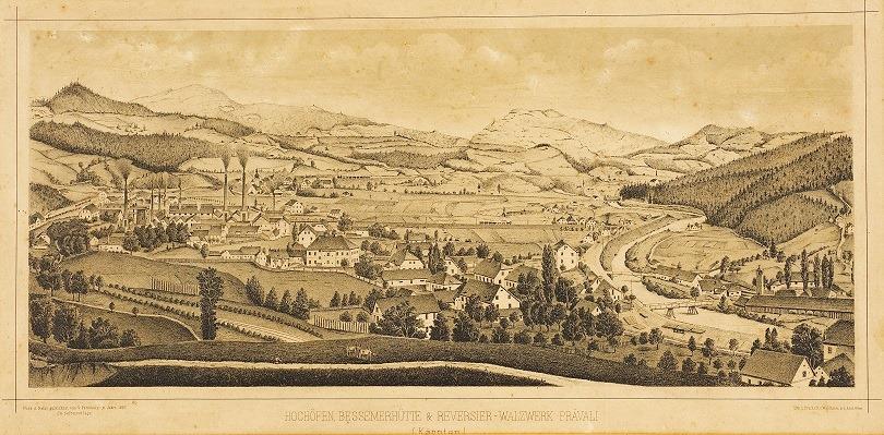 Plavž, Bessemerjev obrat in reverzijska valjarna Prevalje leta 1887, litografija, Vincenc Pernikarz; inv. št. FRK 5128.