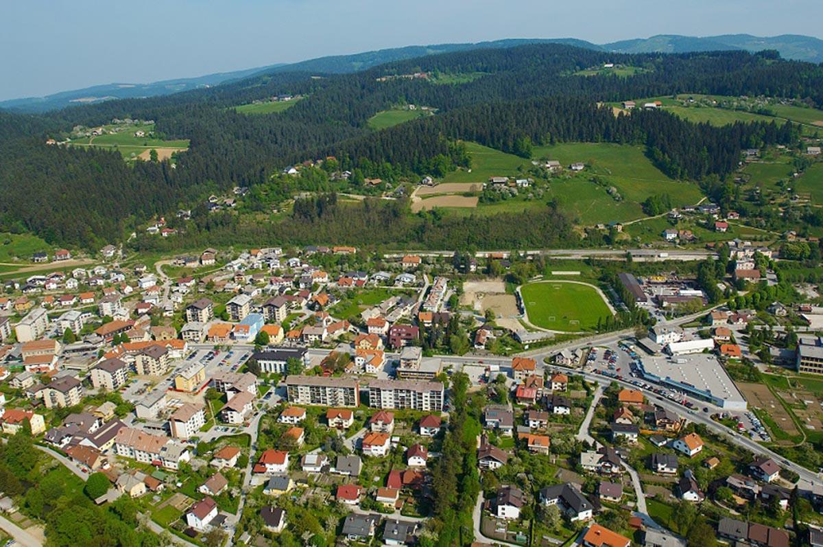 Prevalje z nogometnim stadionom, kjer sta v 19. stoletju obratovala prvi plavž na koks v alpskem prostoru in moderna železarna za proizvodnjo železniških tirnic; foto: Tomo Jeseničnik, arhiv Občine Prevalje.