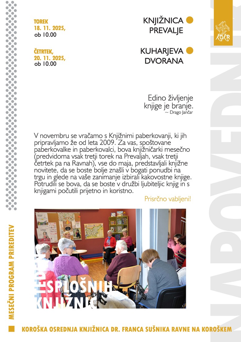 V novembru se vračamo s Knjižnimi paberkovanji, ki jih pripravljamo že od leta 2009. Za vas, spoštovane paberkovalke in paberkovalci, bova knjižničarki mesečno (predvidoma vsak tretji torek na Prevaljah, vsak tretji četrtek pa na Ravnah), vse do maja, predstavljali knjižne novitete, da se boste bolje znašli v bogati ponudbi na trgu in glede na vaše zanimanje izbirali kakovostne knjige. Potrudili se bova, da se boste v družbi ljubiteljic knjig in s knjigami počutili prijetno in koristno.