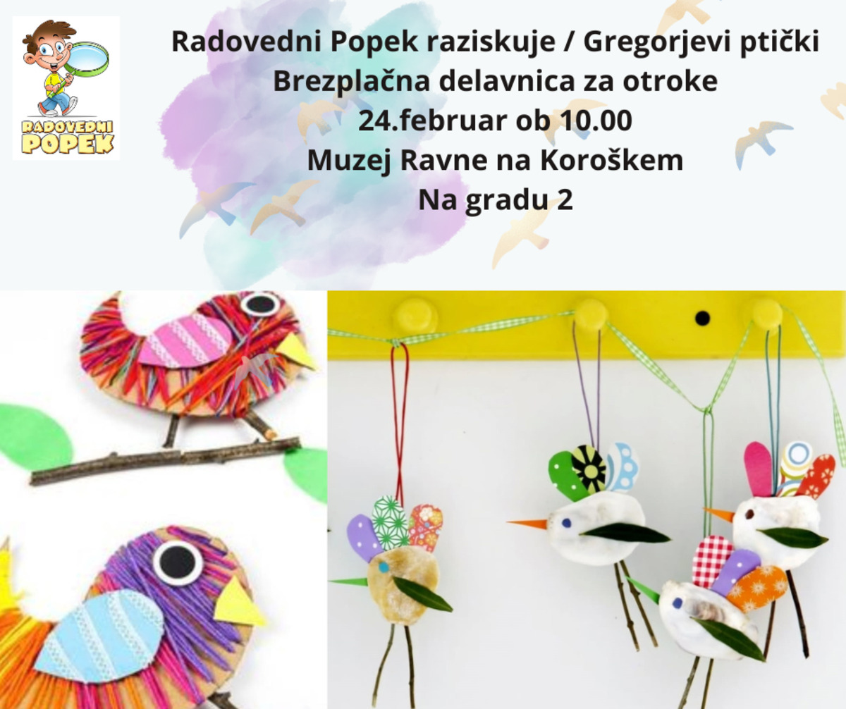 Na počitniški delavnici bomo izdelovali pisane Gregorjeve ptičke ter skozi zgodbice spoznavali pomen praznika Gregorjevo. Delavnica bo trajala 1,5 ure in je namenjena otrokom v starosti od 3 do 10 let. Število mest je omejeno.