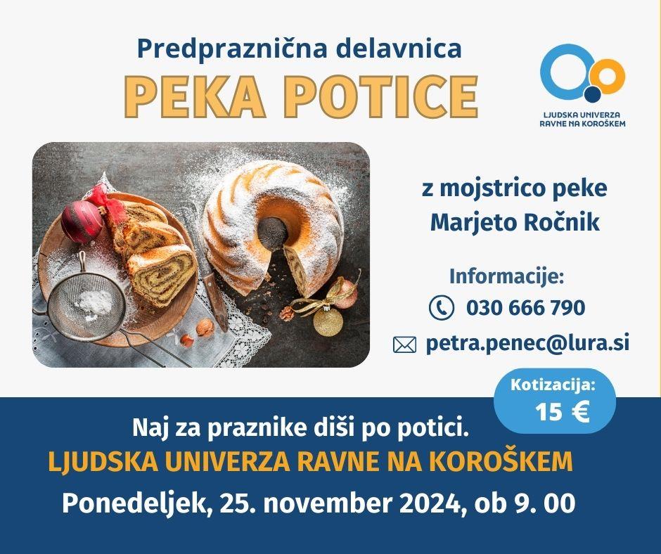 Da boste pekovskemu izzivu v svoji kuhinji lažje kos, vas vabimo, da se udeležite predpraznične delavnice PEKA POTICE , na kateri bomo skupaj spoznavali postopek njene priprave ali preprosto izmenjali izkušnje peke z drugimi.