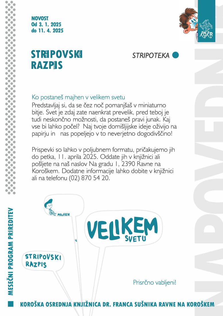 Prispevki so lahko v poljubnem formatu, pričakujemo jih do petka, 11. aprila 2025. Oddate jih v knjižnici ali pošljete na naš naslov Na gradu 1, 2390 Ravne na Koroškem. Dodatne informacije lahko dobite v knjižnici ali na telefonu (02) 870 54 20.