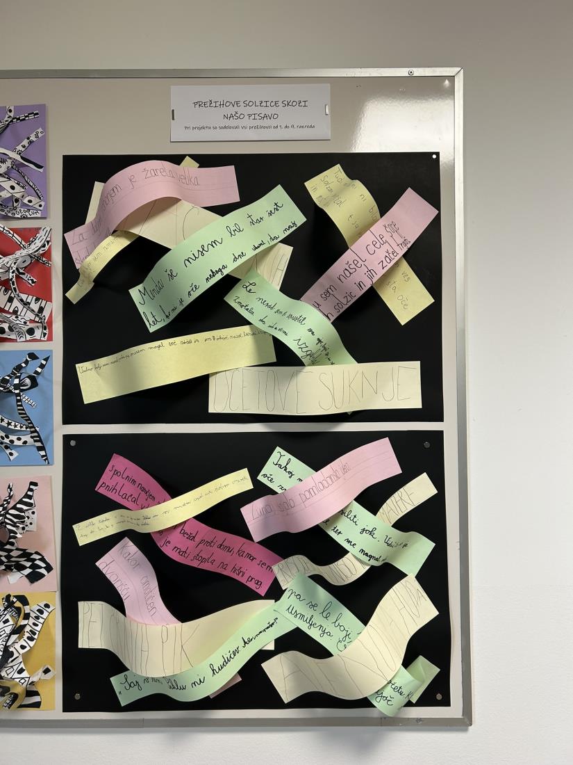 Na Osnovni šoli Prežihovega Voranca je nastala posebna razstava, ki je združila literaturo in likovno umetnost. Učenci od 1. do 9. razreda so na trakove papirja na roko prepisovali odlomke iz Prežihove črtice Solzice, ob tem pa smo ustvarili tudi likovne izdelke – papirnate skulpture in reliefe, ki so dopolnjevali razstavo, nastalo pri likovni umetnosti.
