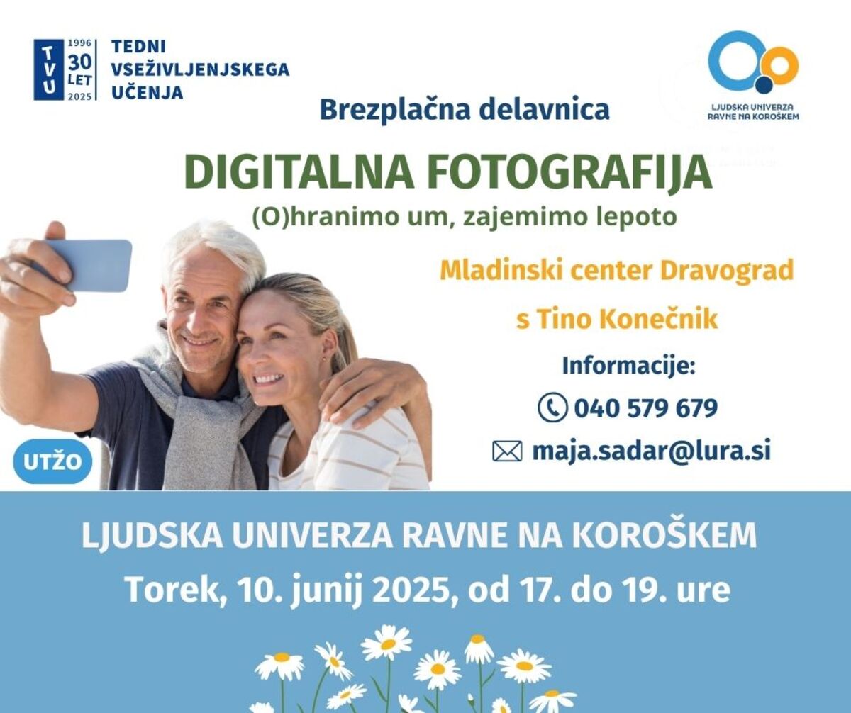 Vabimo vas na delavnico, na kateri bomo skupaj naredili prve korake v svet digitalne fotografije. Spoznali bomo osnovne funkcije pametnih telefonov, se naučili preprostih tehnik za boljše fotografiranje ter govorili o tem, kako ujeti zanimiv trenutek, lepo svetlobo ali čustvo v sliki. Poseben poudarek bomo namenili osnovni obdelavi fotografij. Delavnica je namenjena starejšim, ki želijo na sproščen in razumljiv način razvijati svojo ustvarjalnost in ohranjati radoveden um.