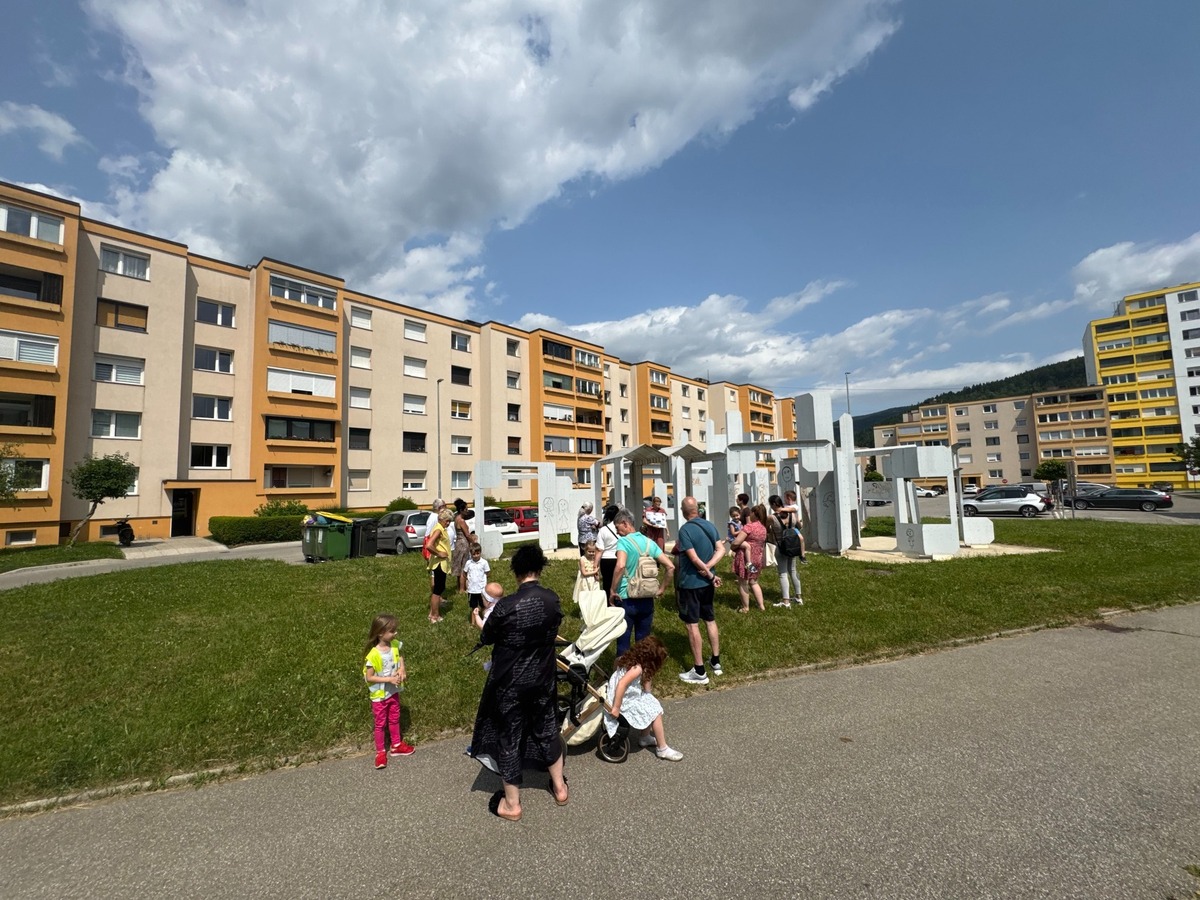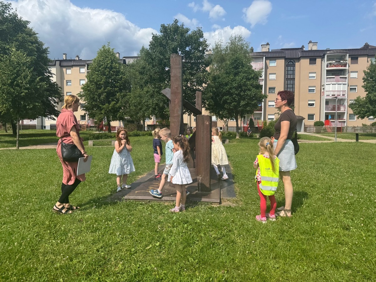 V četrtek, 5. junija, je koroški pokrajinski muzej na Ravnah na Koroškem izvedel dva 𝘃sprehoda med skulpturami ravenske Forma vive (FVR). Na pobudo ZKŠTM so se dopoldan družili z otroki Vrtca Ravne – enote Ajda, ki so v sklopu medgeneracijskega druženja spoznavali lokalno kulturno dediščino. Pobliže smo spoznali vseh 6 skulptur, ki so umeščene v naselje Javornik, kjer se nahaja tudi vrtec Ajda. Otroci so vedoželjno spraševali, odgovarjali in odkrivali, s tem pa dokazali, da FVR tudi po 60. letih ostaja pomemben del lokalne skupnosti.