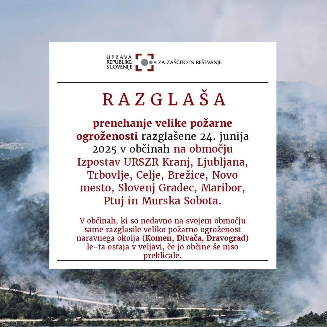 Razglas o prenehanju velike požarne ogroženosti naravnega okolja, razglašene 24. junija 2025