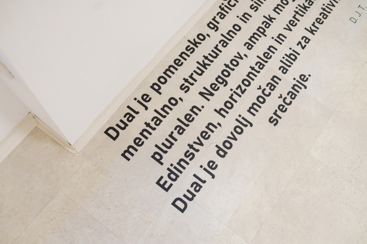 Razstava ni le del cikla z naslovom DUAL, temveč ta pojem predstavlja tudi njen konceptualni okvir. V zaprtem prostoru galerije se umetnika srečata s pogledom in delom drug drugega ter ob tem prepoznata skupno točko: v njunih povsem samosvojih izrazih je vedno prisotna komponenta, ki presega posamezno izkušnjo – tisto, kar je univerzalno človeško in različne poglede povezuje v skladno celoto.