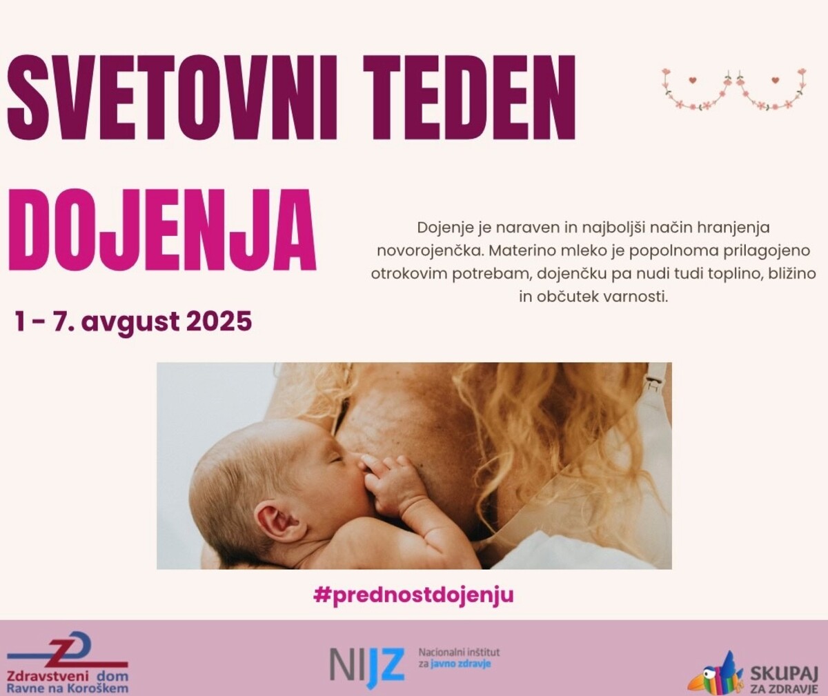 Vsako leto med 1. in 7. avgustom obeležujemo Svetovni teden dojenja, ki poudarja pomen dojenja za zdravje otrok, mater in celotne družbe. Letošnji slogan »Prednost dojenju: razvijajmo trajnostne podporne sisteme« je izpostavil nujnost zagotavljanja podpore doječim materam v različnih okoljih – doma, v zdravstvu, na delovnem mestu in v širši skupnosti.