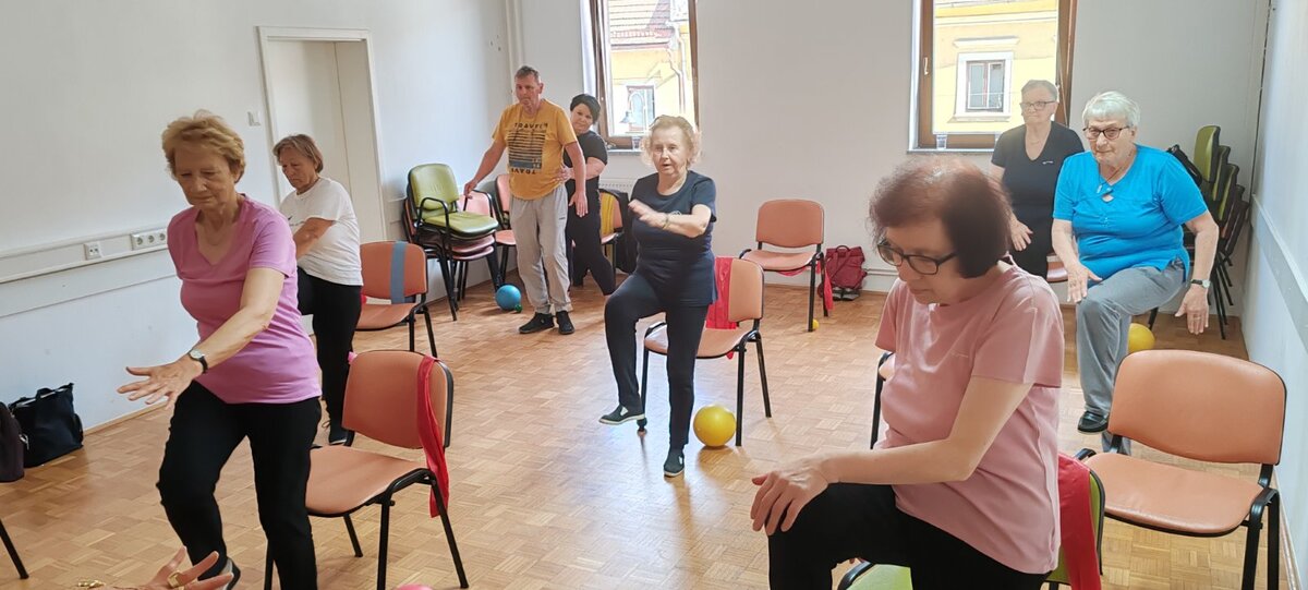 Udeleženci vadijo sede in stoje s poudarkom na krepitvi mišic, ravnotežja, gibljivosti in koordinacije. Pri vajah uporabljajo ježkaste žogice, žoge in elastične trakove za krepitev mišic.
