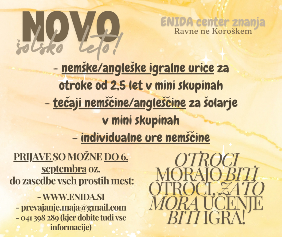 ENIDA je veliko več, kot le jezikovna šola. Vaš otrok bo jezik spoznaval z veseljem (mlajši skozi igro) in v zelo mali skupini, pod budnim očesom mednarodno priznane izkušene učiteljice, ki bo otroka spremljala vso njegovo "jezikovno pot", torej vsa leta učenja.