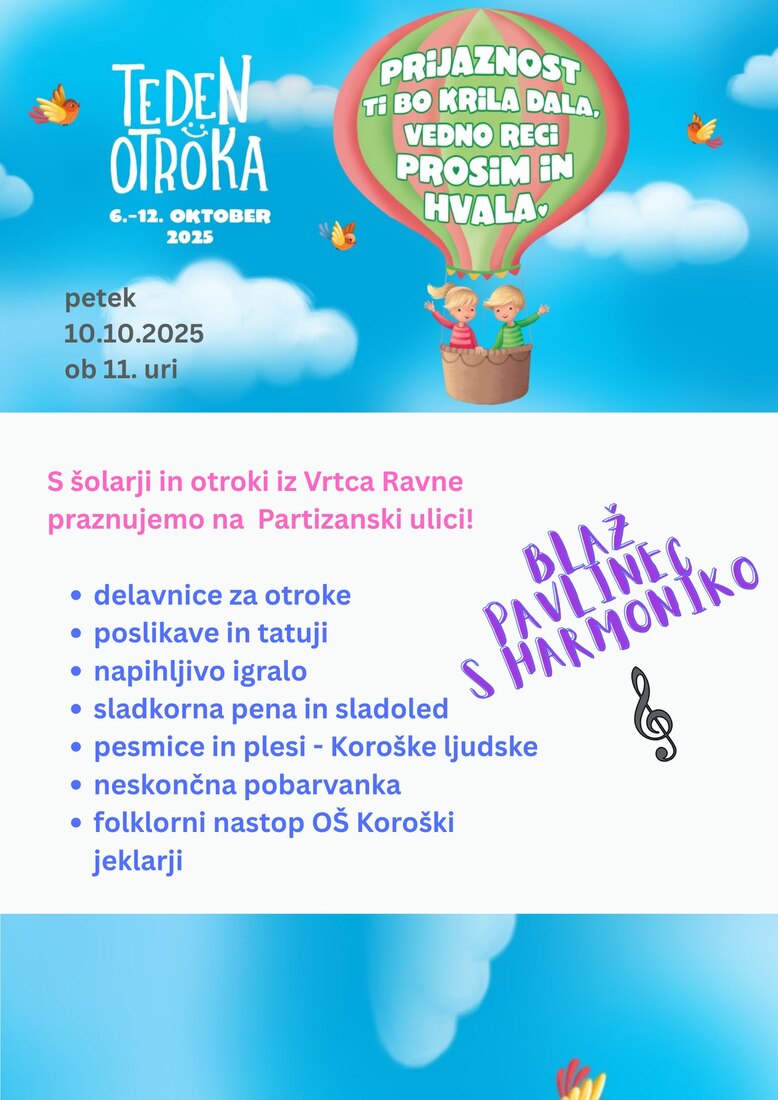 🎉 🎉 𝐏𝐫𝐚𝐳𝐧𝐮𝐣𝐞𝐦𝐨 𝐧𝐚 𝐏𝐚𝐫𝐭𝐢𝐳𝐚𝐧𝐬𝐤𝐢 𝐮𝐥𝐢𝐜𝐢! Ravne na Koroškem – krajevni praznik & Teden otrokaa