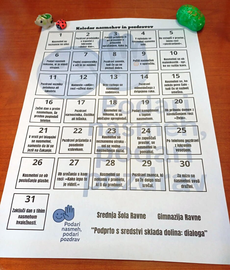 Poleg tega so dijaki zaposlenim podarili koledar z dobrimi dejanji za vsak dan. V njem so zbrani drobni, a pomembni predlogi, kako lahko z majhnimi gestami polepšamo dan sebi ali nekomu drugemu. Gre za dejanja, ki ne zahtevajo veliko, a lahko ustvarijo toplino, razumevanje in nasmeh.