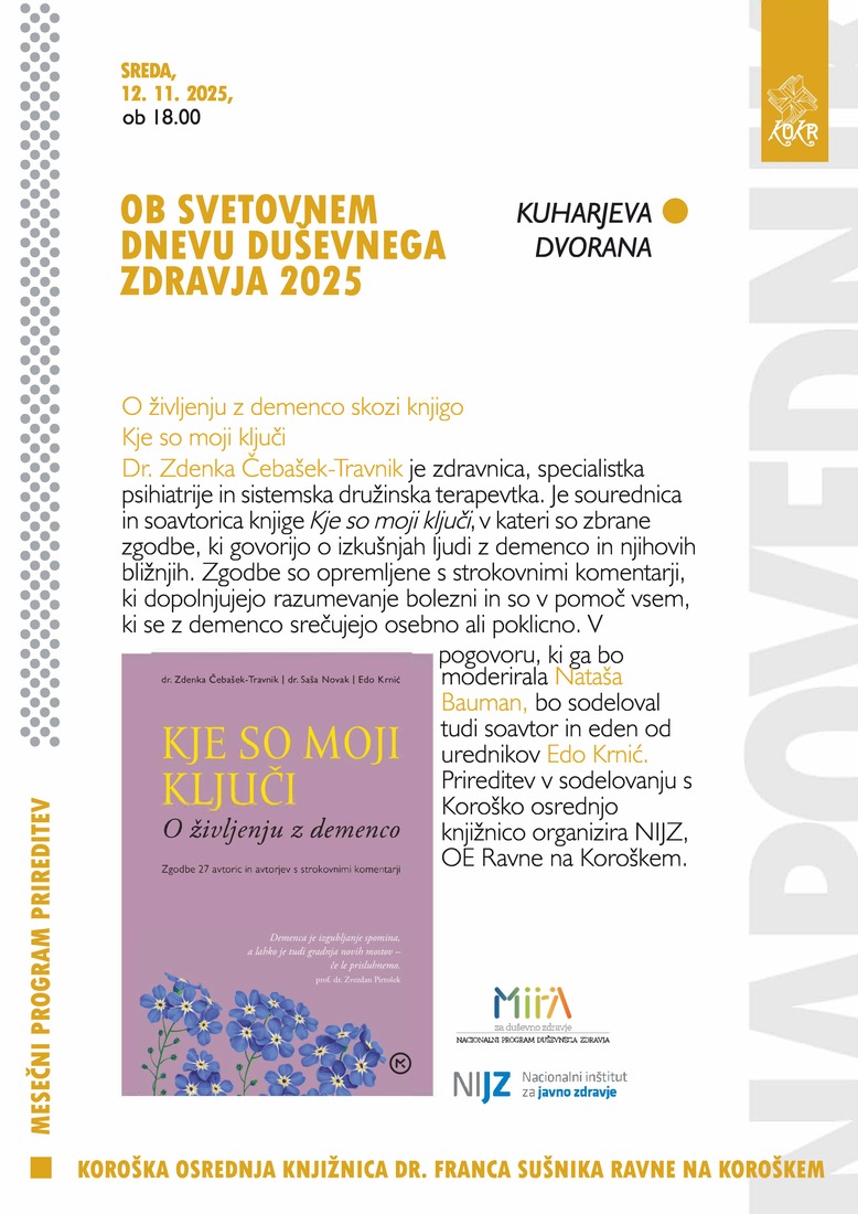 Dr. Zdenka Čebašek-Travnik je zdravnica, specialistka psihiatrije in sistemska družinska terapevtka. Je sourednica in soavtorica knjige Kje so moji ključi, v kateri so zbrane zgodbe, ki govorijo o izkušnjah ljudi z demenco in njihovih bližnjih. Zgodbe so opremljene s strokovnimi komentarji, ki dopolnjujejo razumevanje bolezni in so v pomoč vsem, ki se z demenco srečujejo osebno ali poklicno. V pogovoru, ki ga bo moderirala Nataša Bauman, bo sodeloval tudi soavtor in eden od urednikov Edo Krnić. Prireditev v sodelovanju s Koroško osrednjo knjižnico organizira NIJZ, OE Ravne na Koroškem.