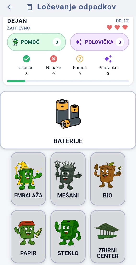 Za otroke smo v okviru mobilne aplikacije razvili igrico pravilnega ločevanja odpadkov, ki spodbuja učenje skozi igro. Uporabniki morajo v njej pravilno razvrstiti kar 360 vrst odpadkov, pri čemer igra ponuja tri težavnostne stopnje in več podnivojev.