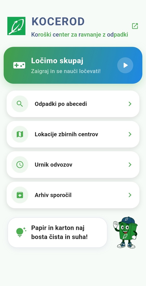 Eden izmed naših novih produktov je mobilna aplikacija KOCEROD, ki uporabnikom omogoča dostop do urnikov odvozov odpadkov, zemljevida lokacij zbirnih centrov in njihovega delovnega časa. Aplikacijo bomo v prihodnje še nadgrajevali glede na potrebe uporabnikov, že prihodnje leto pa bo ponujala tudi interaktivne urnike.