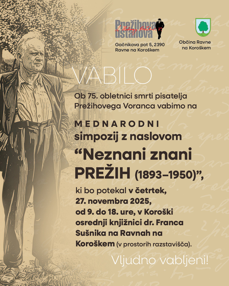 Ob 75. obletnici smrti pisatelja Prežihovega Voranca vabimo na mednarodni simpozij z naslovom »Neznani znani PREŽIH (1893–1950)«, ki bo potekal v četrtek, 27. novembra 2025, od 9. do 18. ure, v Koroški osrednji knjižnici dr. Franca Sušnika na Ravnah na Koroškem (v prostorih razstavišča). 18 raziskovalcev bo predstavilo sveže interpretacije, do sedaj neznane ali prezrte vidike koroškega pisatelja.
