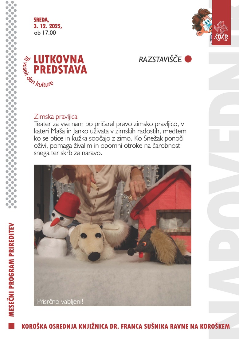 Teater za vse nam bo pričaral pravo zimsko pravljico, v kateri Maša in Janko uživata v zimskih radostih, medtem ko se ptice in kužka soočajo z zimo. Ko Snežak ponoči oživi, pomaga živalim in opomni otroke na čarobnost snega ter skrb za naravo.