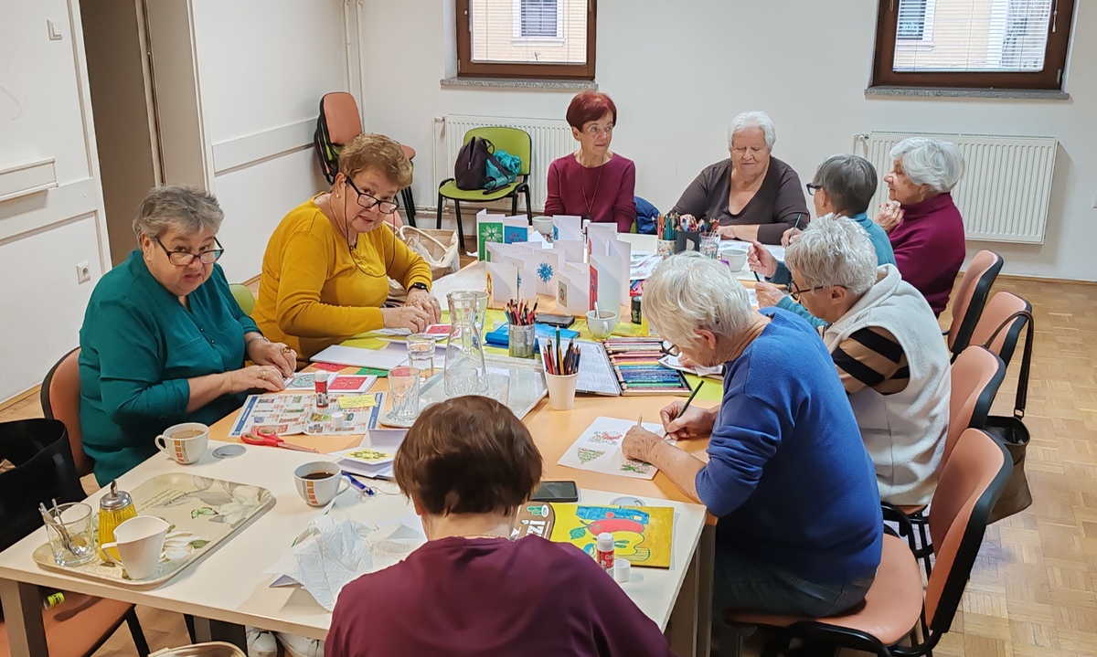 Na delavnici ustvarjamo voščilnice, čestitke in pobarvanke, ki krasijo stene naših prostorov in so darila za naše goste.