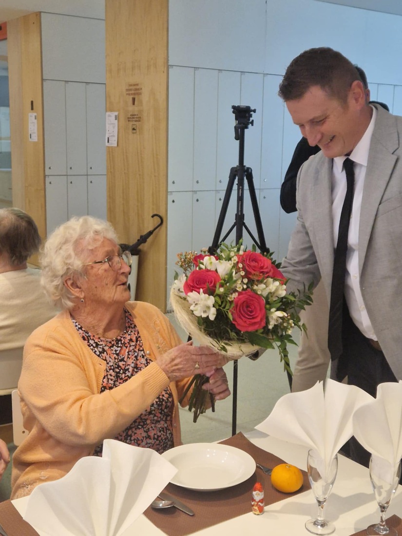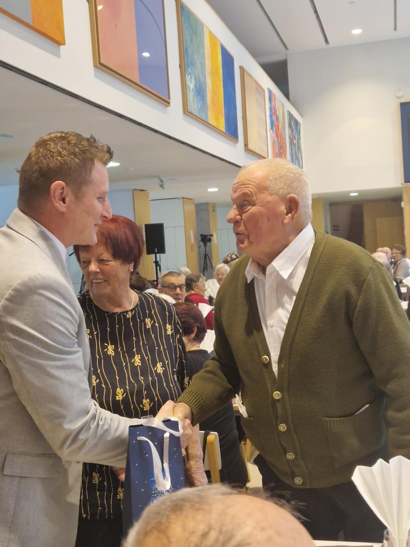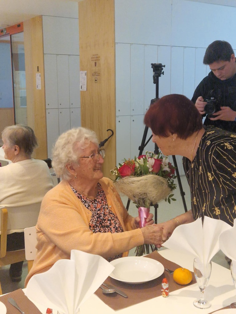 Rdeči križ je tudi letos pripravili majhno pozornost za najstarejša udeleženca srečanja – gospo Homan in gospoda Čekona. Darilo so jima skupaj predali podžupan Andrej Erjavec, Magdalena Piko in Franja Mlakar. Gesta, ki je v dvorani pustila veliko topline in ganjenih pogledov.