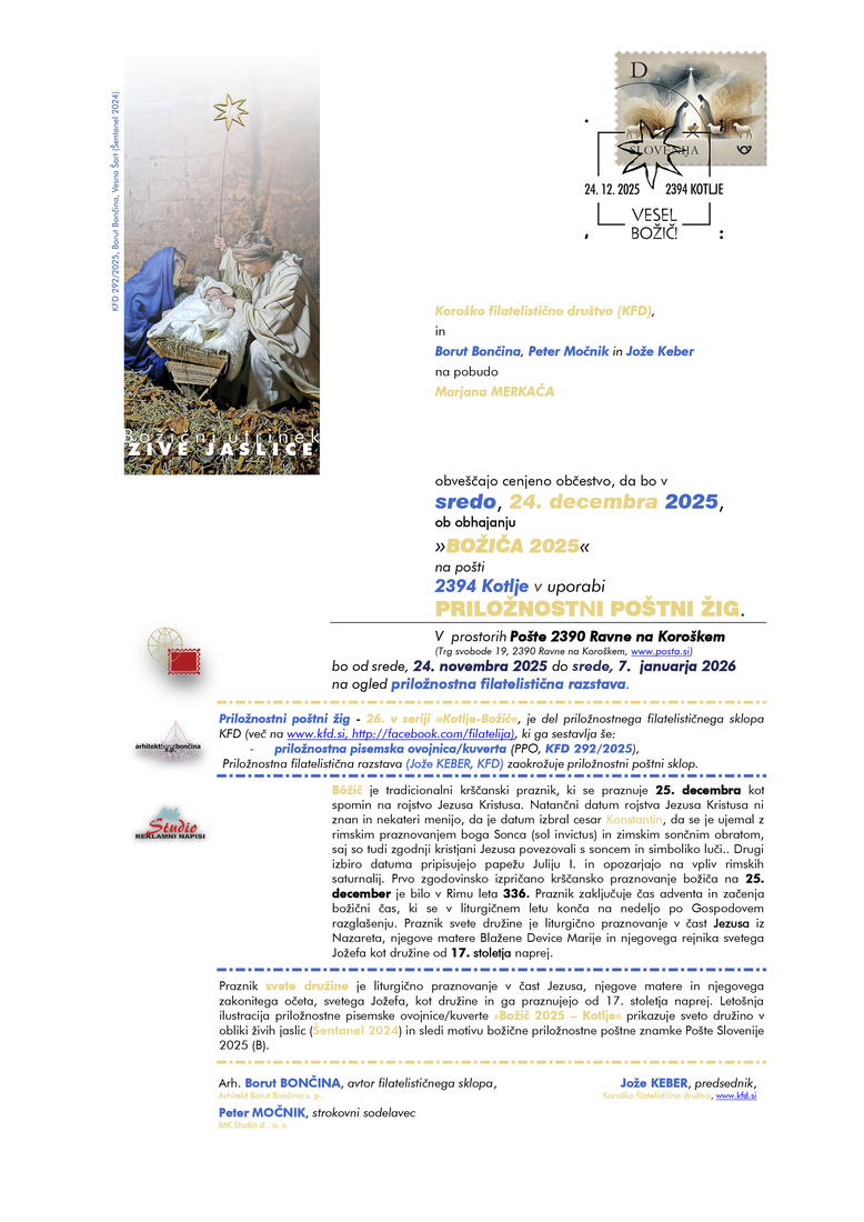Koroško filatelistično društvo letos že 26. zapored obeležuje božič in z njim povezane praznike s priložnostnim filatelističnim sklopom, ki ga sestavljata priložnostni poštni žig, ki je tradicionalno v uporabi na predbožični dan, 24. decembra, na pošti 2394 Kotlje in priložnostne pisemske ovojnice na temo božiča. Letošnja ilustracija na pisemski ovojnici prikazuje sveto družino v obliki živih jaslic. Priložnostni filatelistični sklop zaokrožuje priložnostna filatelistična razstava, ki jo je na temo »Božič« v prostorih pošte 2390 Ravne na Koroškem postavil Jože Keber (KFD).