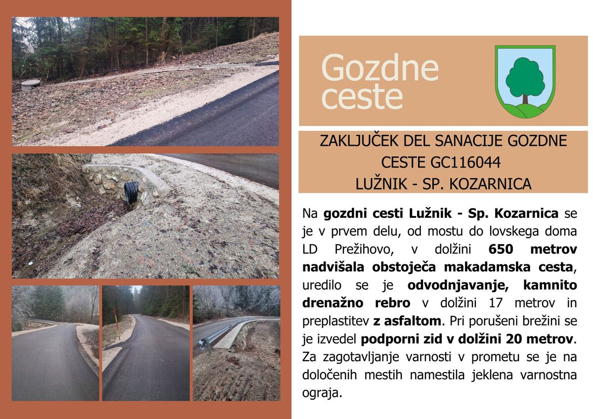 Zaključek del sanacije gozdne ceste GC 116044 Lužnik-sp. Kozarnica