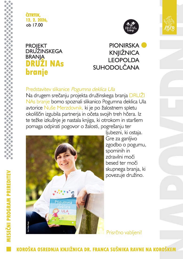 Na drugem srečanju projekta družinskega branja DRUŽI NAs branje bomo spoznali slikanico Pogumna deklica Ula avtorice Nuše Merzdovnik, ki je po žalostnem spletu okoliščin izgubila partnerja in očeta svojih treh hčera. Iz te težke izkušnje je nastala knjiga, ki otrokom in staršem pomaga odpirati pogovor o žalosti, pogrešanju ter ljubezni, ki ostaja. Gre za ganljivo zgodbo o pogumu, spominih in zdravilni moči besed ter moči skupnega branja, ki povezuje družino.