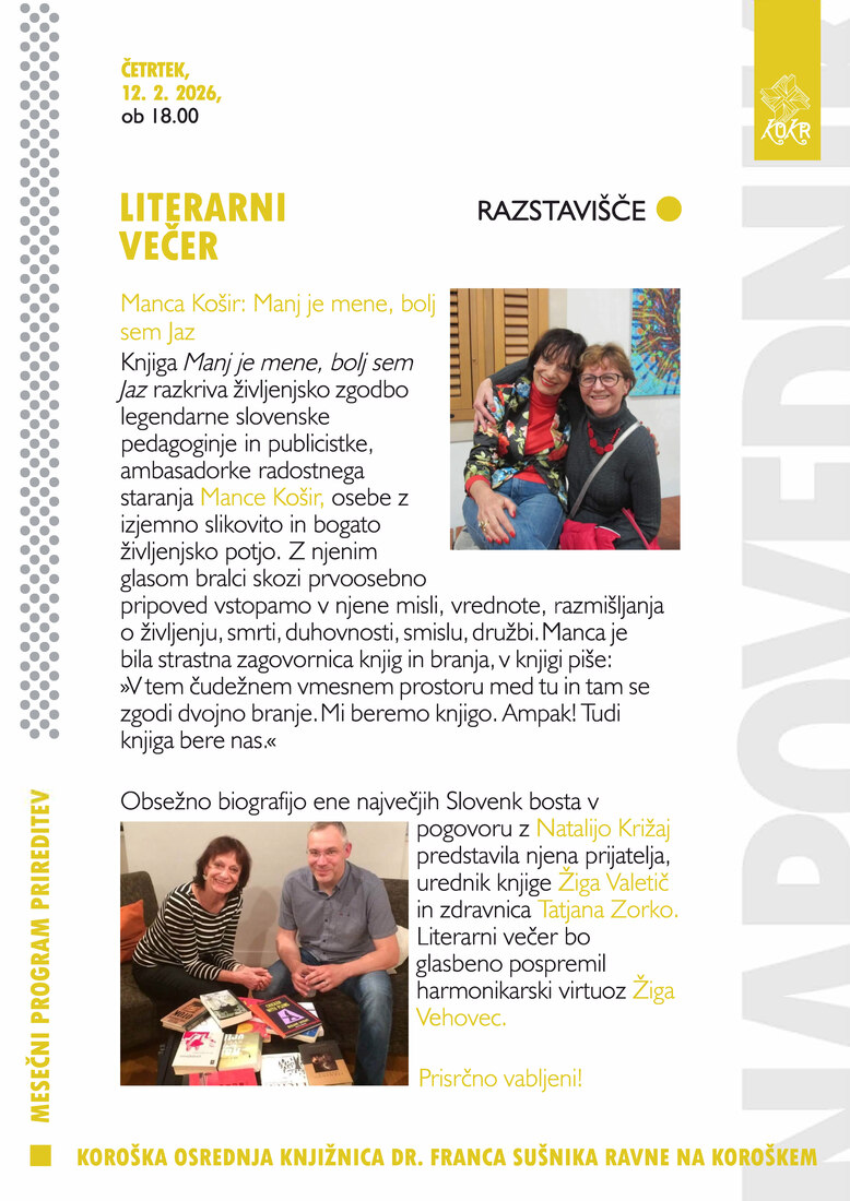 Obsežno biografijo ene največjih Slovenk bosta v pogovoru z Natalijo Križaj predstavila njena prijatelja, urednik knjige Žiga Valetič in zdravnica Tatjana Zorko. Literarni večer bo glasbeno pospremil harmonikarski virtuoz Žiga Vehovec.
