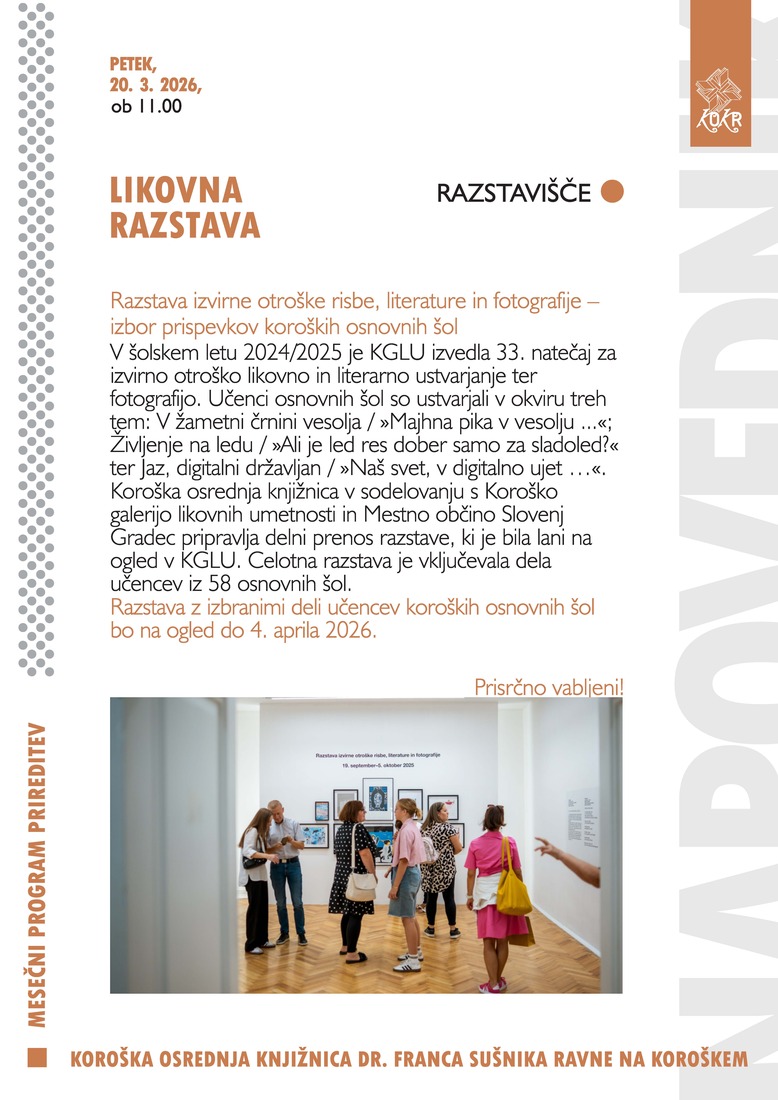 Razstava z izbranimi deli učencev koroških osnovnih šol bo na ogled do 4. aprila 2026.