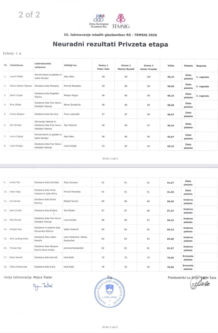 V starostni skupini 1A – evfonij je dosegel 99,33 od 100 možnih točk, kar je izjemen rezultat in potrditev njegovega resnega ter vztrajnega dela.