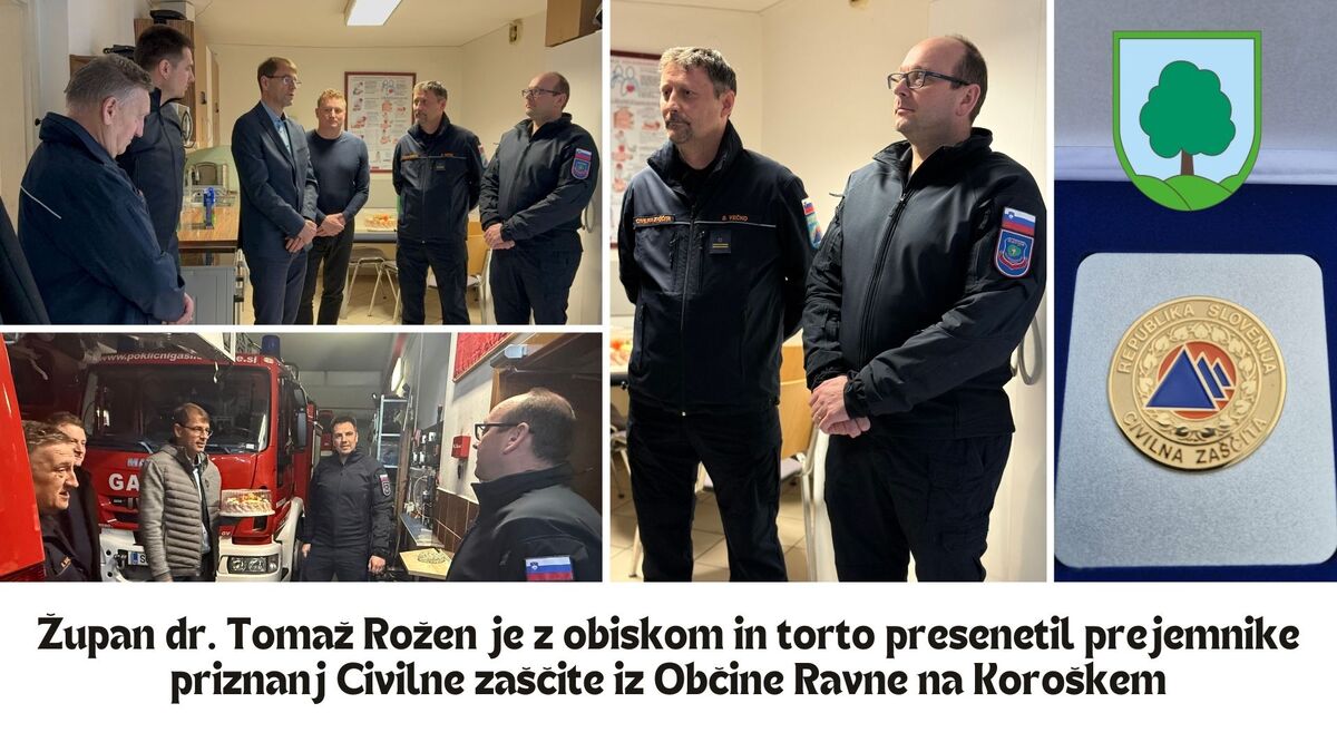 Župan dr. Tomaž Rožen s svojo ekipo čestital nagrajencem Civilne zaščite - Koroškemu gasilskemu zavodu in namestniku poveljnika Štaba CZ Občine Ravne, Borisu Večku