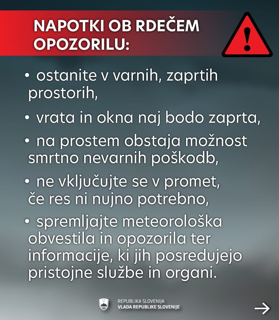Za območje severne Slovenije od včeraj velja rdeče vremensko opozorilo za naslednjih 36 ali 48 ur. Pričakovani so sunki severnega vetra bodo ponekod lahko presegali 100 km/h, kar lahko povzroči podiranje dreves, odkrivanje streh, nevarnosti v prometu, izpade električne energije, …