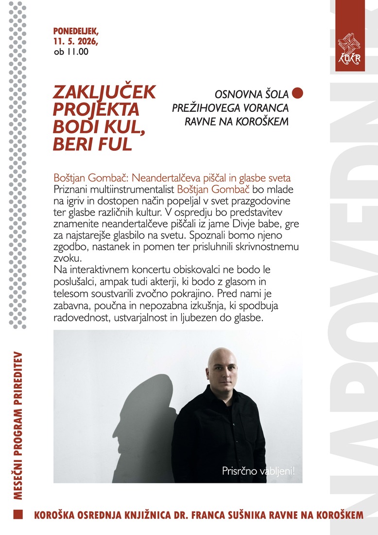 Priznani multiinstrumentalist Boštjan Gombač bo mlade na igriv in dostopen način popeljal v svet prazgodovine ter glasbe različnih kultur. V ospredju bo predstavitev znamenite neandertalčeve piščali iz jame Divje babe, gre za najstarejše glasbilo na svetu. Spoznali bomo njeno zgodbo, nastanek in pomen ter prisluhnili skrivnostnemu zvoku.