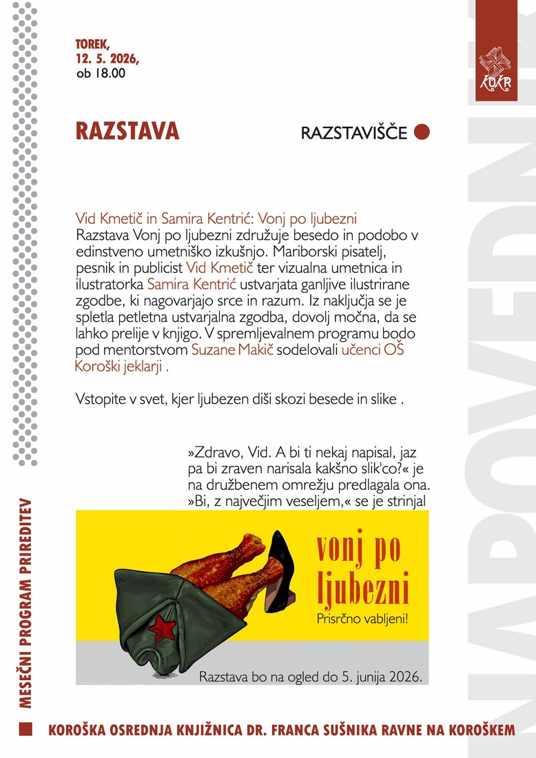 Razstava Vonj po ljubezni združuje besedo in podobo v edinstveno umetniško izkušnjo. Mariborski pisatelj, pesnik in publicist Vid Kmetič ter vizualna umetnica in ilustratorka Samira Kentrić ustvarjata ganljive ilustrirane zgodbe, ki nagovarjajo srce in razum. Iz naključja se je spletla petletna ustvarjalna zgodba, dovolj močna, da se lahko prelije v knjigo. V spremljevalnem programu bodo pod mentorstvom Suzane Makič sodelovali učenci OŠ Koroški jeklarji.