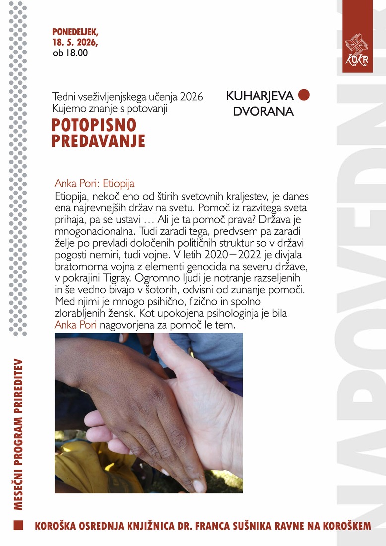 Etiopija, nekoč eno od štirih svetovnih kraljestev, je danes ena najrevnejših držav na svetu. Pomoč iz razvitega sveta prihaja, pa se ustavi … Ali je ta pomoč prava? Država je mnogonacionalna. Tudi zaradi tega, predvsem pa zaradi želje po prevladi določenih političnih struktur so v državi pogosti nemiri, tudi vojne. V letih 2020−2022 je divjala bratomorna vojna z elementi genocida na severu države, v pokrajini Tigray. Ogromno ljudi je notranje razseljenih in še vedno bivajo v šotorih, odvisni od zunanje pomoči. Med njimi je mnogo psihično, fizično in spolno zlorabljenih žensk. Kot upokojena psihologinja je bila Anka Pori nagovorjena za pomoč le tem.