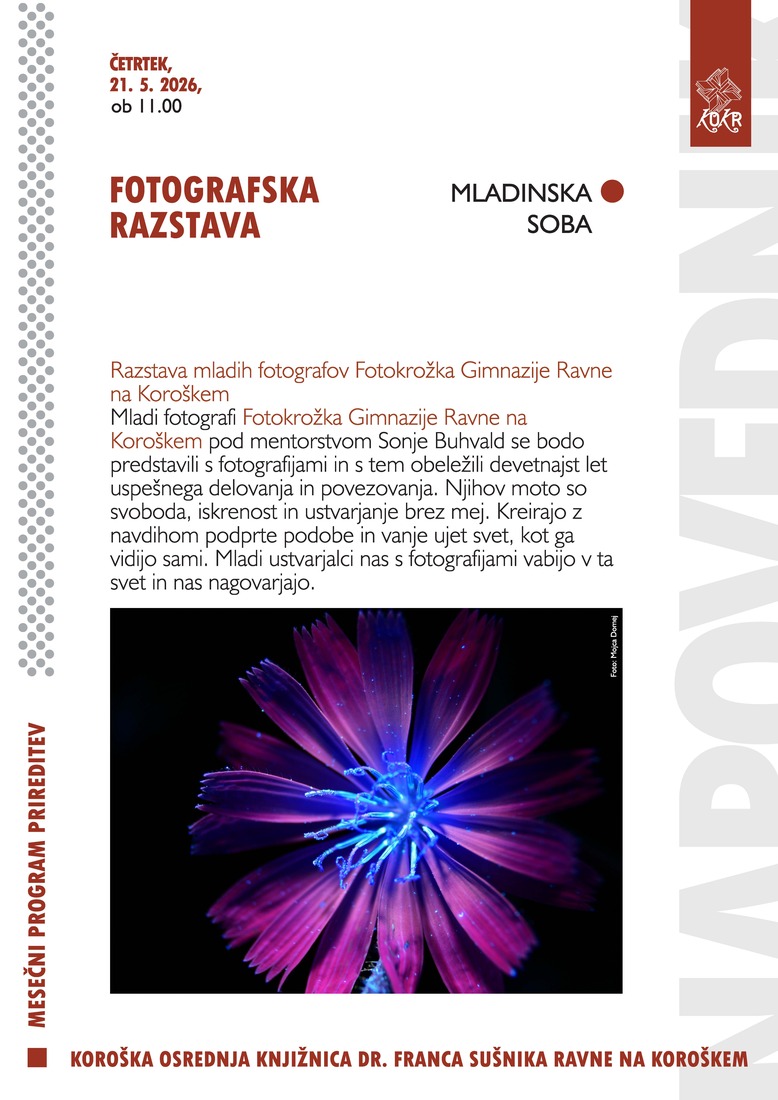 Mladi fotografi Fotokrožka Gimnazije Ravne na Koroškem pod mentorstvom Sonje Buhvald se bodo predstavili s fotografijami in s tem obeležili devetnajst let uspešnega delovanja in povezovanja. Njihov moto so svoboda, iskrenost in ustvarjanje brez mej. Kreirajo z navdihom podprte podobe in vanje ujet svet, kot ga vidijo sami. Mladi ustvarjalci nas s fotografijami vabijo v ta svet in nas nagovarjajo.