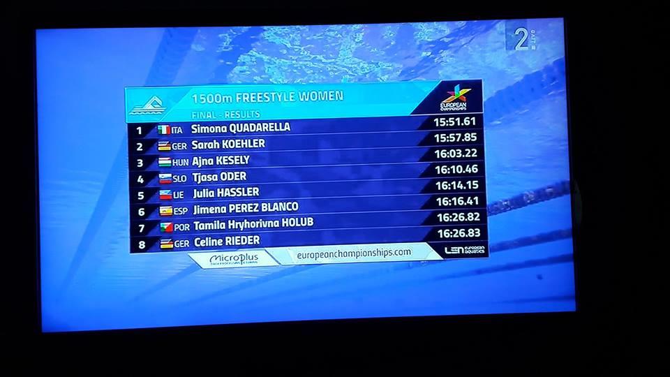 Člansko evropsko prvenstvo v plavanju v Glasgowu na Škotskem je plavalki Slovenije ter članici PK Fužinar Tjaši Oder v disciplini 1500 m prosto prineslo odlično mesto časom 16.10,46 je Ravenčanka osvojila 4. mesto.