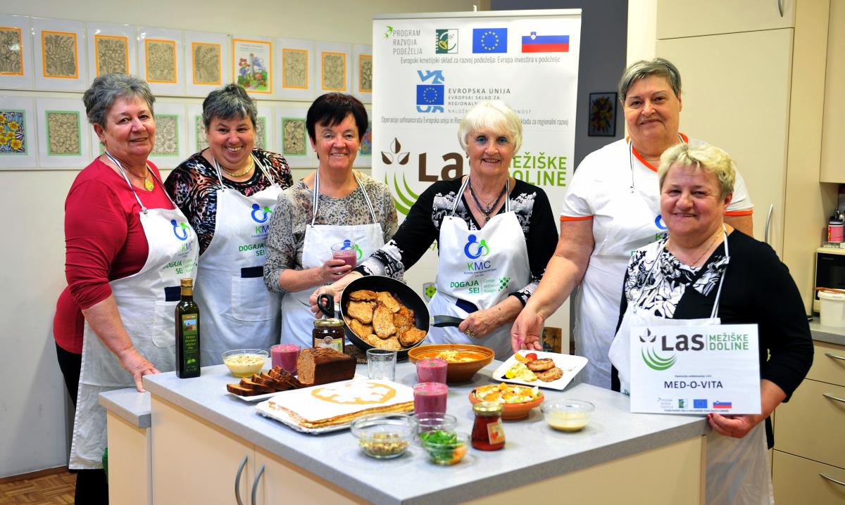 LAS Mežiške doline je v sodelovanju s Koroškim medgeneracijskim centrom na Ravnah na Koroškem izvedel kulinarično delavnico v okviru operacije sodelovanja, Med – o – vita. Podobne aktivnosti so se odvile še v Škofji Loki, Idriji in na Hrvaškem, v Labinu. Partnerstvo bo poleg tega izdalo publikacijo s kuharskimi recepti jedi, katerih sestavina je tudi med. Namen aktivnosti je sodelovanje med različnimi skupinami, spodbujanje mednarodnega povezovanja, izmenjava znanj in povezovanje čebelarskih društev. Pred samo delavnico smo člane čebelarskih društev prosili za recepte. Nekaj so jih poslali tudi dijaki, ki obiskujejo čebelarski krožek na Srednji šoli Ravne. Izbranih je bilo sedem jedi, ki so jih pripravile obiskovalke Medgeneracijskega centra. Poleg medenih rezin in smoothija, ki ju nismo vključili v ožji nabor za publikacijo, so bile pripravljene še medeni kruh, solata s pomarančami in medom, svinjski medaljoni z medom, strjenka z medenim prelivom in piščančja obara z medom. Slednji recept, ki je bil nagrajen že s strani Čebelarske zveze Slovenije, je prispeval Janez Pušnik iz Prevalj. Slikovni material je zagotovil Aleksander Ocepek. Posebej smo ponosni, da je bil med kot sestavina iz lokalnega okolja. Prijaznemu donatorju, lokalnemu čebelarju, Maksiju Kajzerju, se še posebej zahvaljujemo.